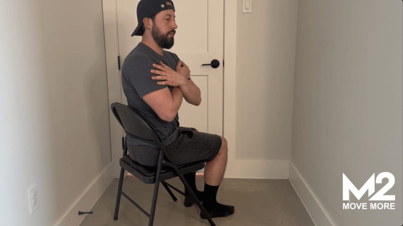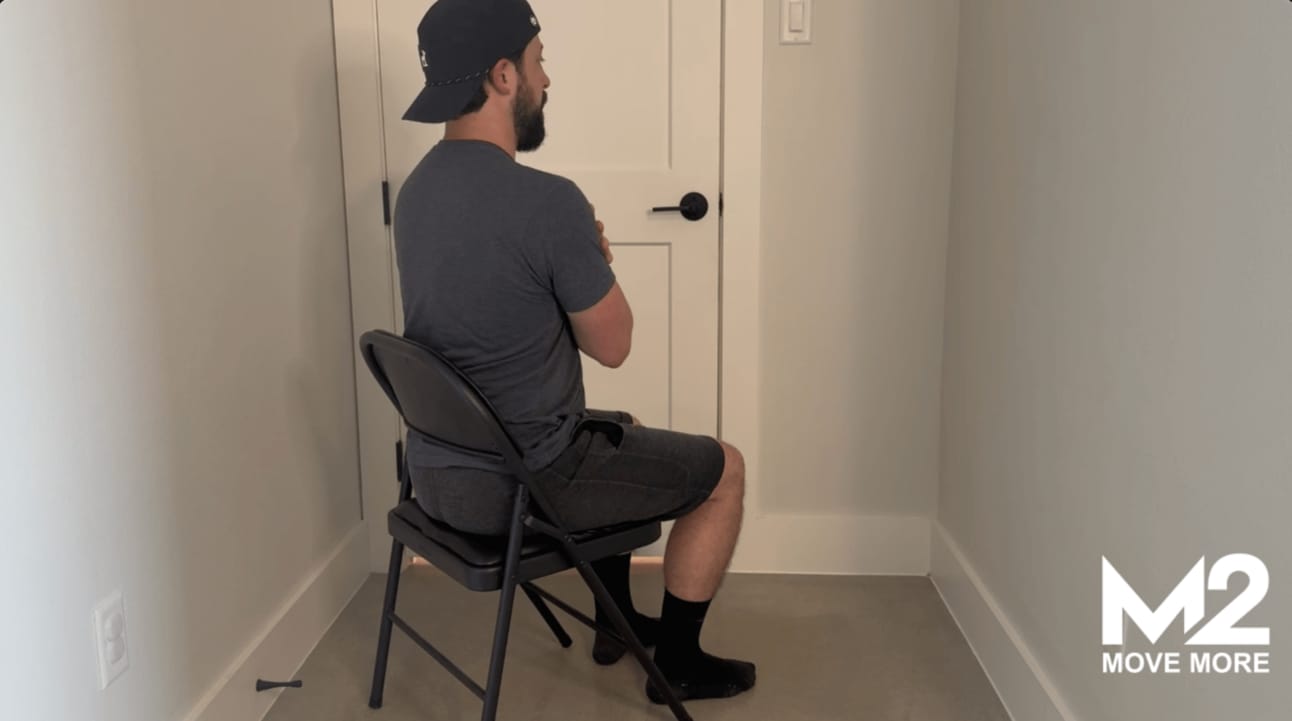 Facing the corner of a room, sit upright in a chair with feet flat on the floor and arms crossed over your chest.