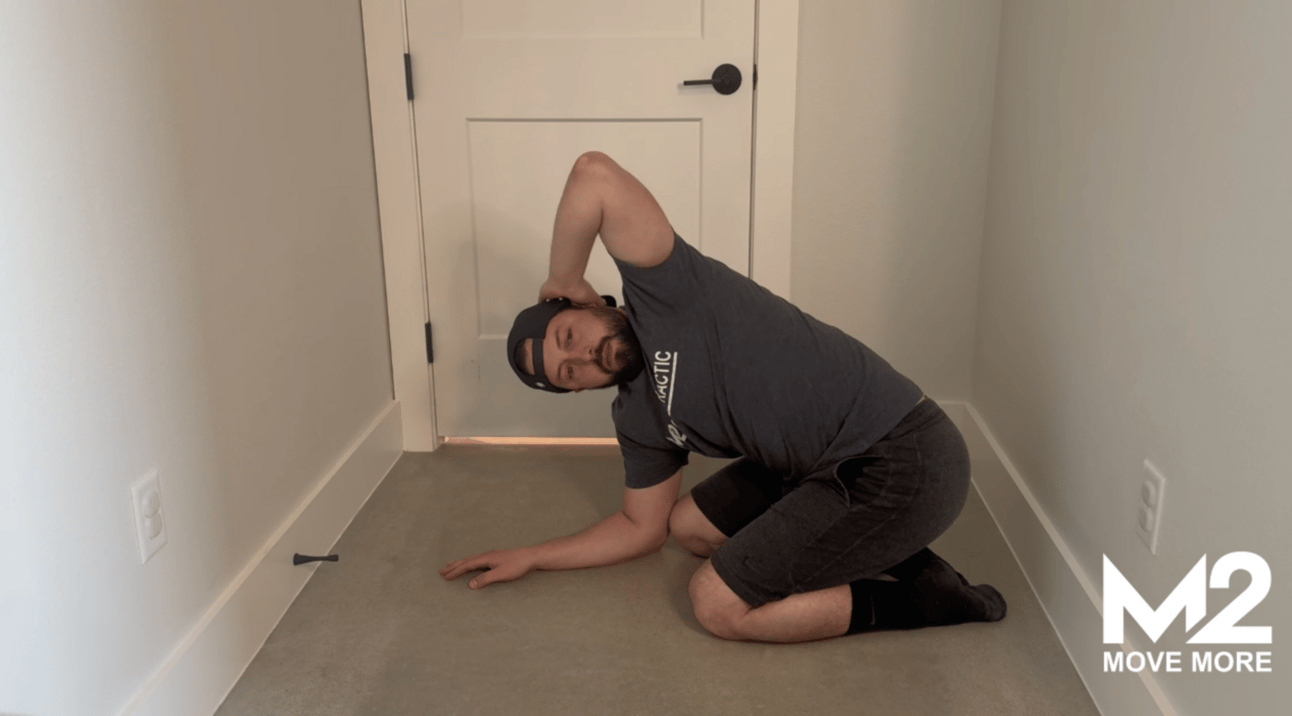 Rotate your upper back, pointing your elbow toward the ceiling while keeping your lower back still.