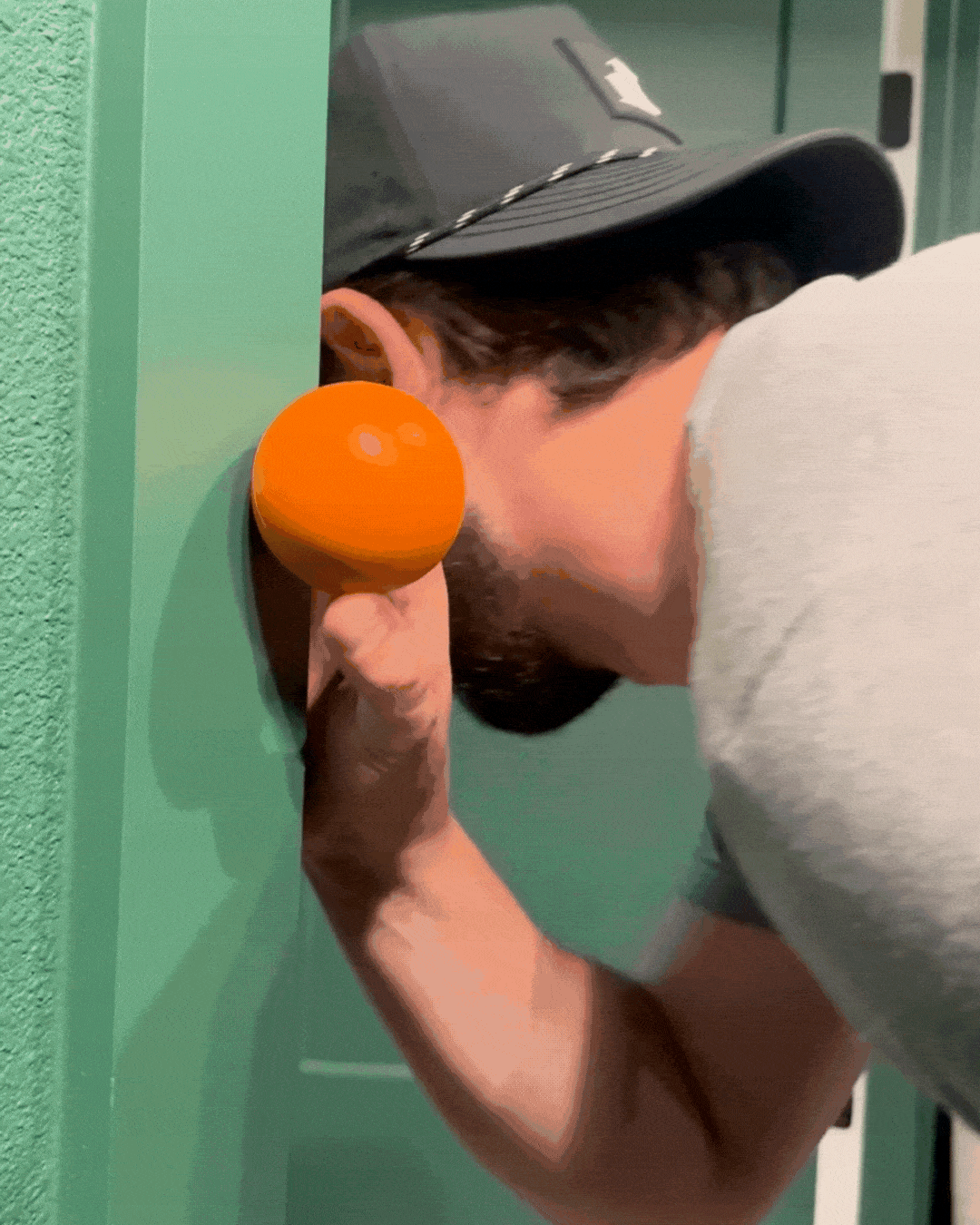 Place the lacrosse ball in a doorway between the frame and the top of your shoulder/neck.